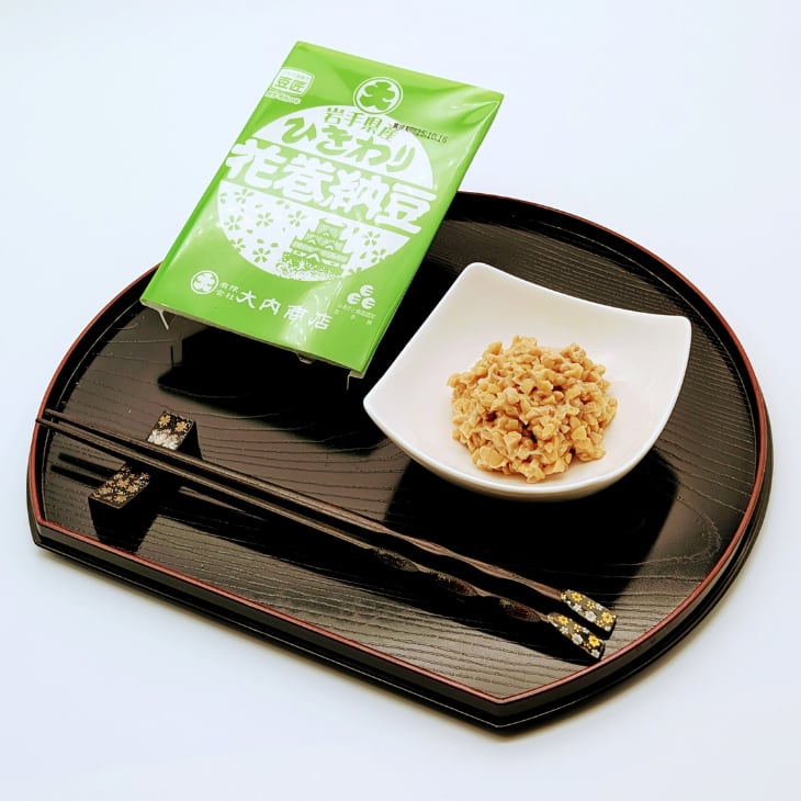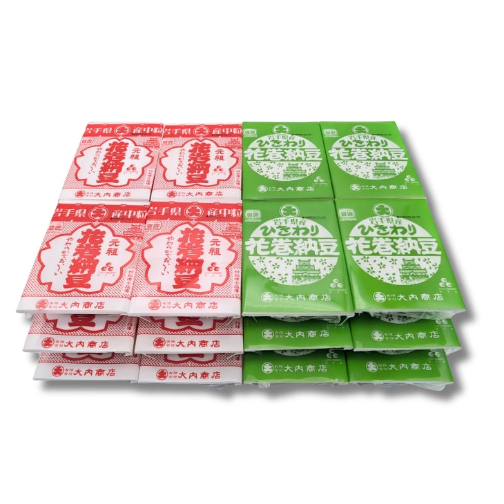 看板商品「花巻納豆」のラインナップから、岩手県産ナンブシロメ、リュウホウの中粒とひきわりのセット。