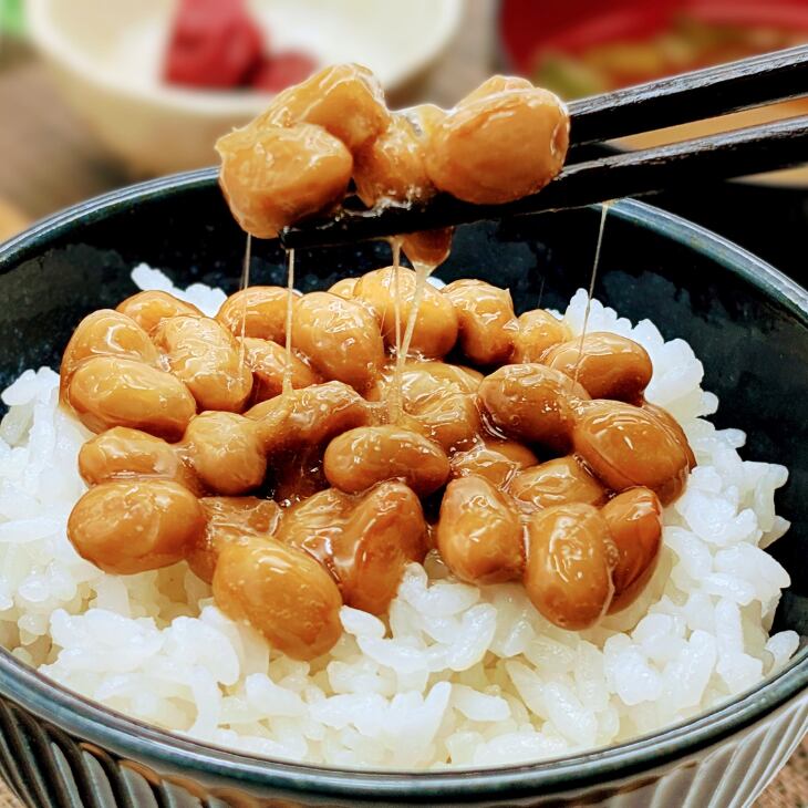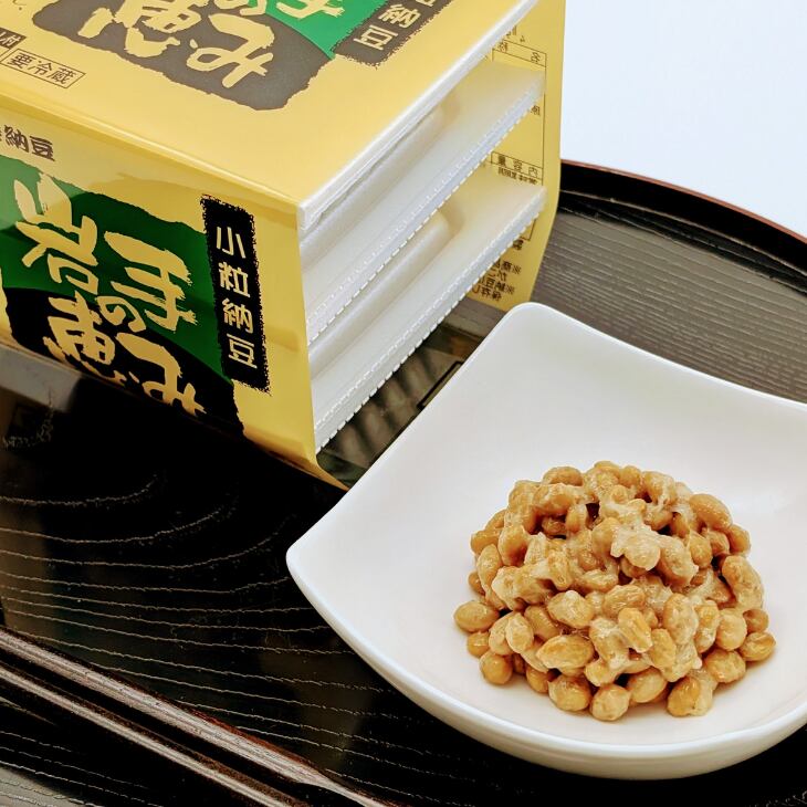●岩手の恵み小粒:岩手県産の希少品種であるすずほのか小粒大豆を使用し、じっくり低圧にて蒸し上げてもっちりやわらかに仕上げました。また超熟醗酵製法により納豆本来のねばりと風味豊かな納豆をご賞味ください。