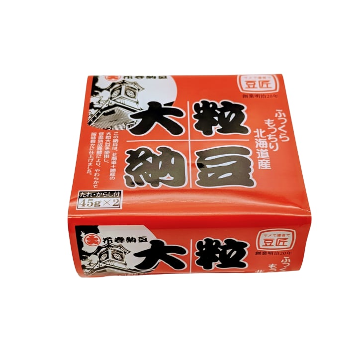 ●大粒納豆:北海道産のユキホマレ大粒大豆を使用し、じっくり低圧にて蒸し上げて大豆本来の旨味を引き出し、もっちりやわらかに仕上げました。また超熟醗酵製法により納豆本来のねばりと風味豊かな納豆をご賞味ください。